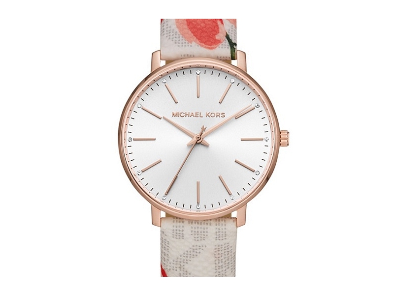 Elegantna in dovršena modna ura MICHAEL KORS z ohišjem v rose gold barvi in pisanim usnjenim paskom nam je odvzela dih. Očarala nas je tudi s številčnico, ki jo krasijo kristalčki, ki so nanizani v vsaki polni uri.