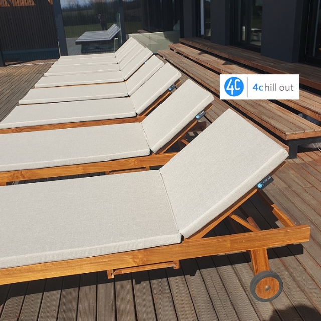Lepa in udobna blazina za ležalnik v dimenziji 190x75x5cm je slovenski proizvod, saj jo proizvajamo sami v podjetju 4C d.o.o. pod blagovno znamko 4Chill Out. Izdelamo jo iz trše poliuretanske pene in ima preklop, da blazino lažje nastavljate glede na naklon ležalnika. Na fotografiji so blazine za ležalnike, ki smo jih izdelali v umazano bež outdoor tkanini in krasijo eno izmed najlepših vil v Poreču.