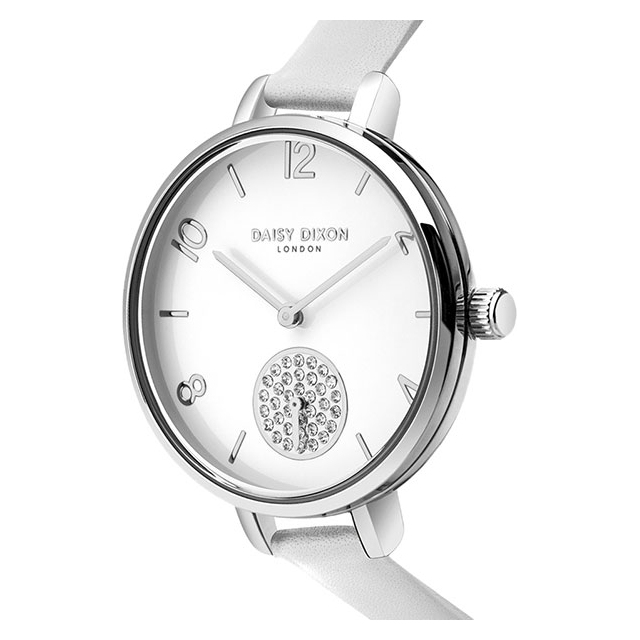 Čudovita, elegantna ženska ura zelo modne znamke DAISY DIXON iz Londona. Zaznamujeta jo eleganten dizajn in čiste linije. Ženska ura je trenutno ena najbolj iskanih ženskih ur, saj jo nosijo vse znane blogerke. Ura je srebrne barve in ima beli pasek.
