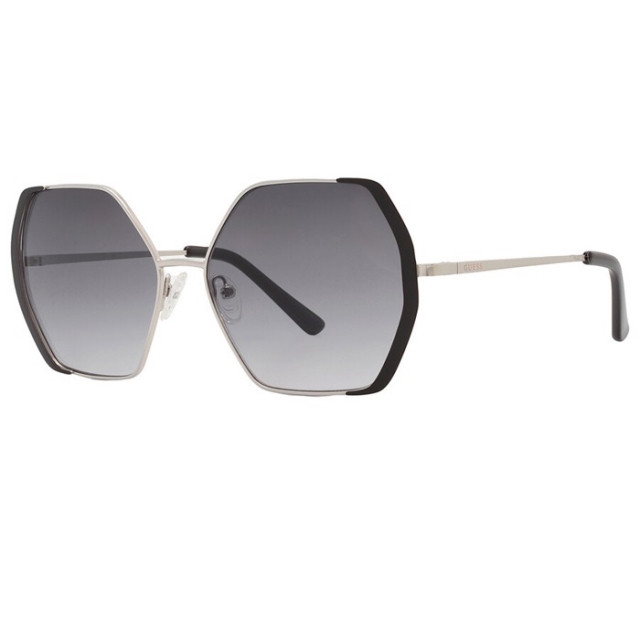 Modna ženska sončna očala blagovne znamke GUESS v srebrni barvi in sivimi lečami.