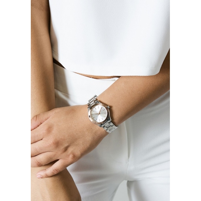 Ta prečudovita ženska ura blagovne znamke MICHAEL KORS ima čudovit srebrni pasek in je zelo natančno izdelana. Všečna je zaradi kombinacije barv, kjer se prepletata srebrna in rosegold barvi. Zaradi svoje elegantne oblike je primerna za nošenje k elegantnim oblačilom kakor tudi bolj športnemu jeansu in casual oblačilom. Primerna za dame, ki so jim ljubše manjše, bolj diskretne ure.
