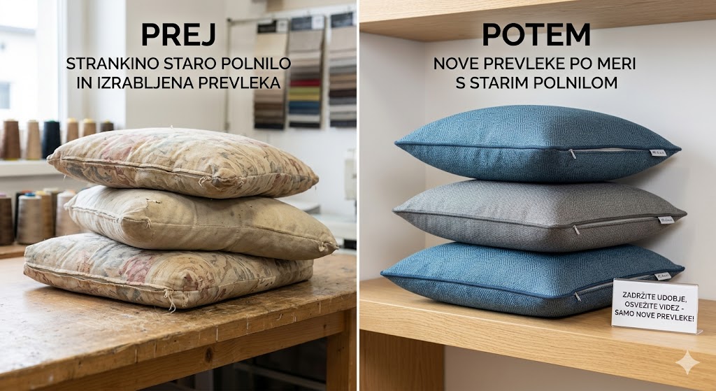 Ni potrebe po nakupu celotnih novih blazin. Pri 4C d.o.o. vam ponujamo trajnostno in ugodno rešitev: izdelavo novih prevlek po meri, medtem ko obdržite svoja obstoječa polnila!